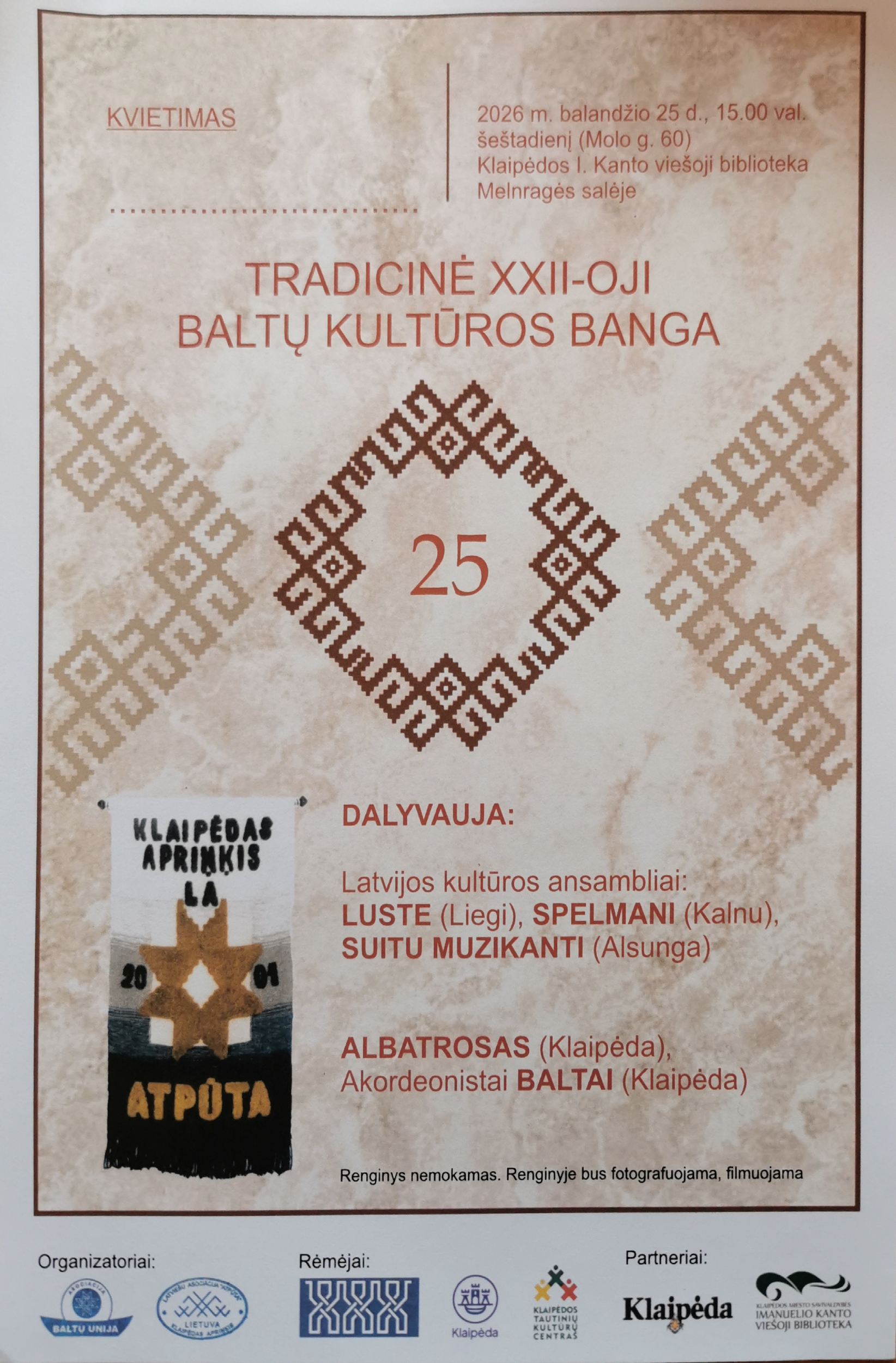 Į tradicinę „Baltų kultūros bangą“ kviečia Klaipėdos apskrities latvių asociacija „Atpūta“.