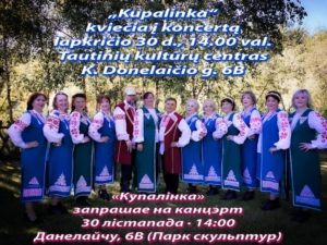 Mieli draugai, ansamblis „Kupalinka“ kviečia į koncertą, kuris vyks lapkričio 30 d. (sekmadienį) Tautinių kultūrų centro patalpose, K. Donelaičio g. 6B (skulptūrų parke), nuo 14.00 val. Įėjimas nemokamas.