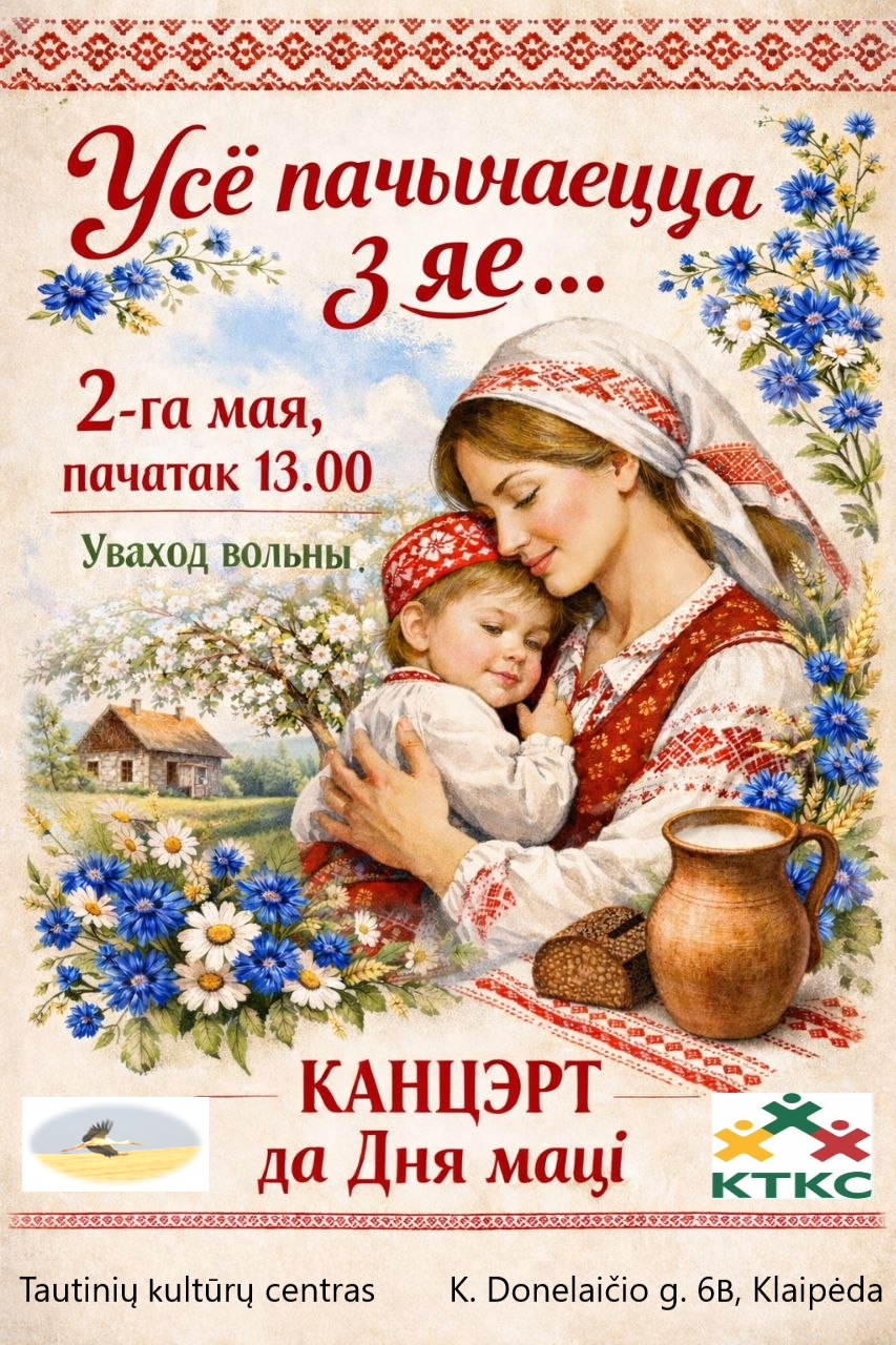 Mieli draugai, kviečiame visus į koncertą pavadinimu „Viskas prasideda nuo jos…“, skirtą Motinos dienai. Dalyvaus ansamblis „Kupalinka“ ir vaikų ansamblis „Verasok“. Koncertas vyks sekmadienį, gegužės 2 d., Tautinių kultūrų centre (skulptūrų parke). Įėjimas nemokamas.